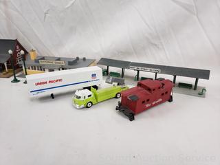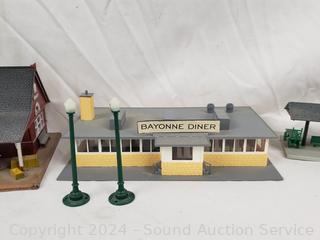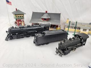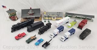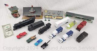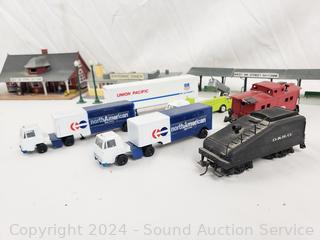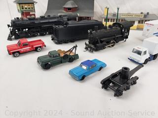 Lot #0128: Assorted HO Scale Trains, Cars, Buildings