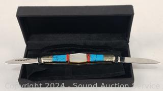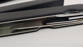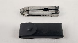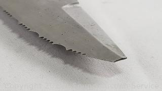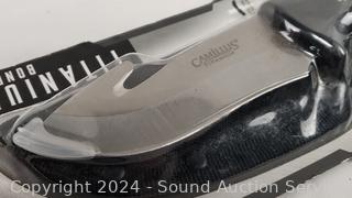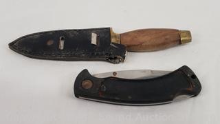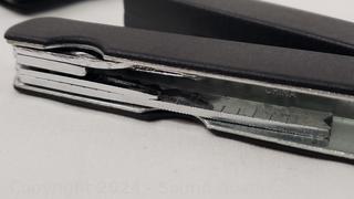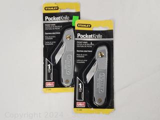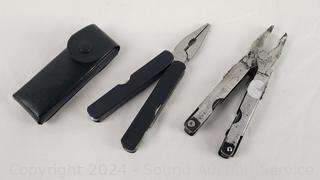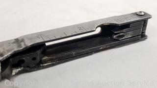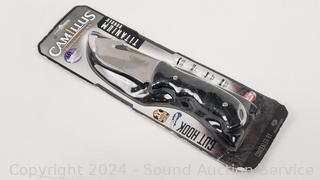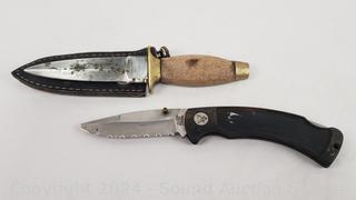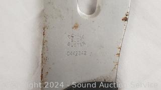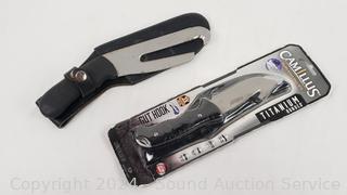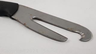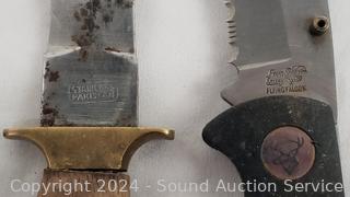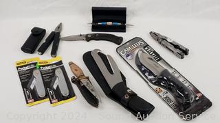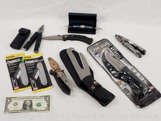Schrade MOP pocketknife, Camilus Gut Hook knife, Stanley pocketknives, Gerber multi-tool, Buck gutting knife, Pakistan dagger, and others. Some signs of wear from use.