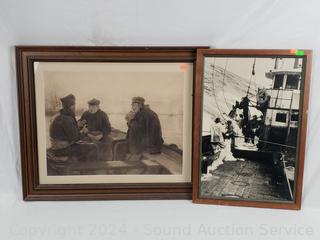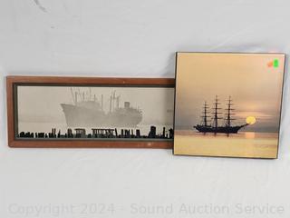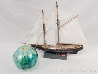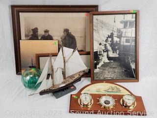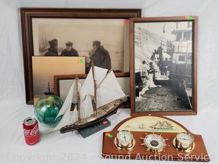 Wood Model Ship 13" H x 18.5", 5.5" Glass Float, 4pc Wall Decor Artwork Approx. 7.5" to 23" W/L, Wall Mount Weather Station.