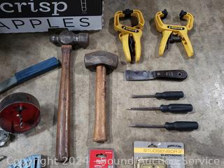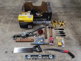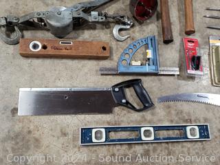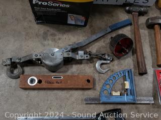 Cable Winch, Planes, Clamps, Levels, Planes, Hammers, Sanding Kit & Mure. Refer to photos for lot contents, more details.
