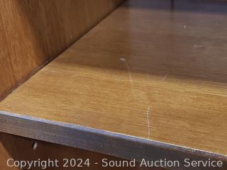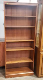 5 shelves, 4 are adjustable. Some minor scuffs, wear to finish. Appears to be all wood construction. 73.5" H x 30" W x 11" D.