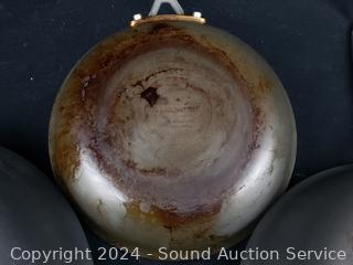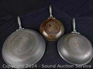 Signs of wear from use, heat stains. 8", 10", 12" skillets.
