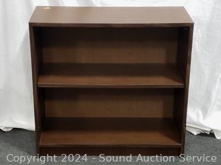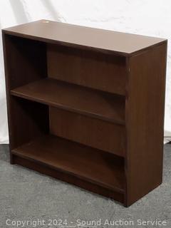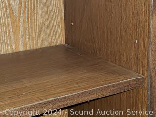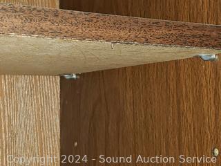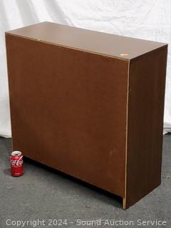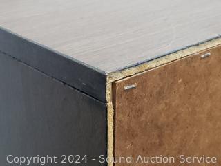 Particle board construction, wood grain laminate finish. 29" H x 30.5" W x 12" D. Some scuffs, dings, scratches in finish.