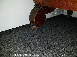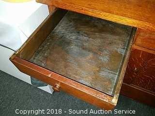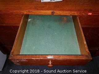 Has 4 drawers, wooden casters, felt-lined center drawer, large lower drawer. Approx. 54" tall, 54" long and 23" deep.