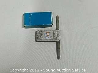 Also comes with Gulf money clip/manicure set. Horn button goes on a 1930's Pontiac. Bank does not have a key. Razor comes with blades.
