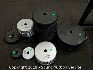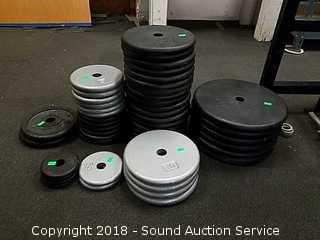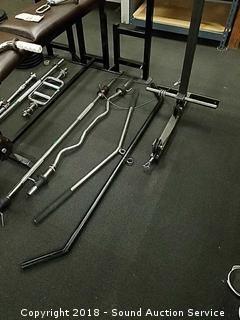 Includes: 1.5lbs to 25 lbs weights with curl bars. 63 pieces total. This is a great lot with weight machine, bench and lots of Various bars.