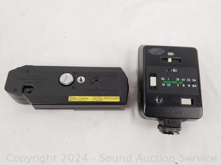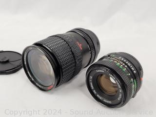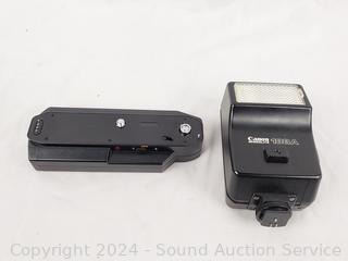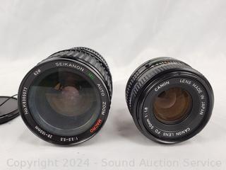 Untested, unknown condition. 2 Canon 50mm 1:1.8 lens, Seikanon 1:3.5-5.5 lens, Power Winder, Canon 188AFlash.