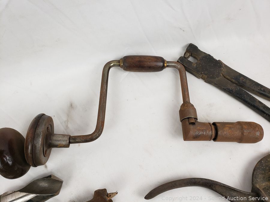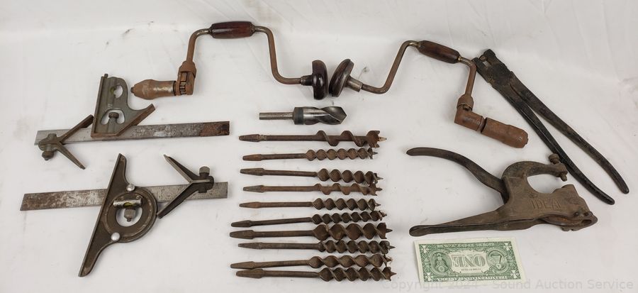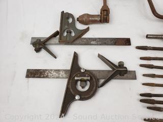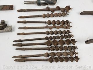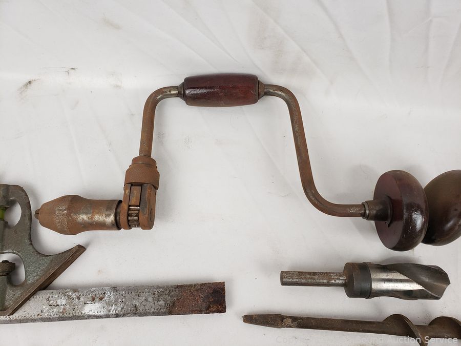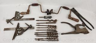 Lot #0134: Rustic Vintage Auger Bits, Braces, Combination Square