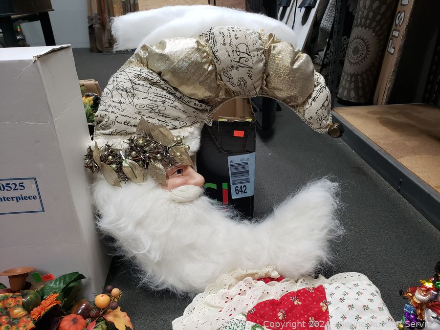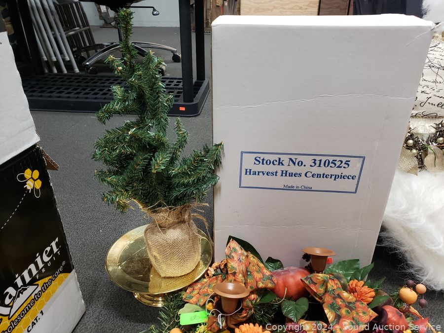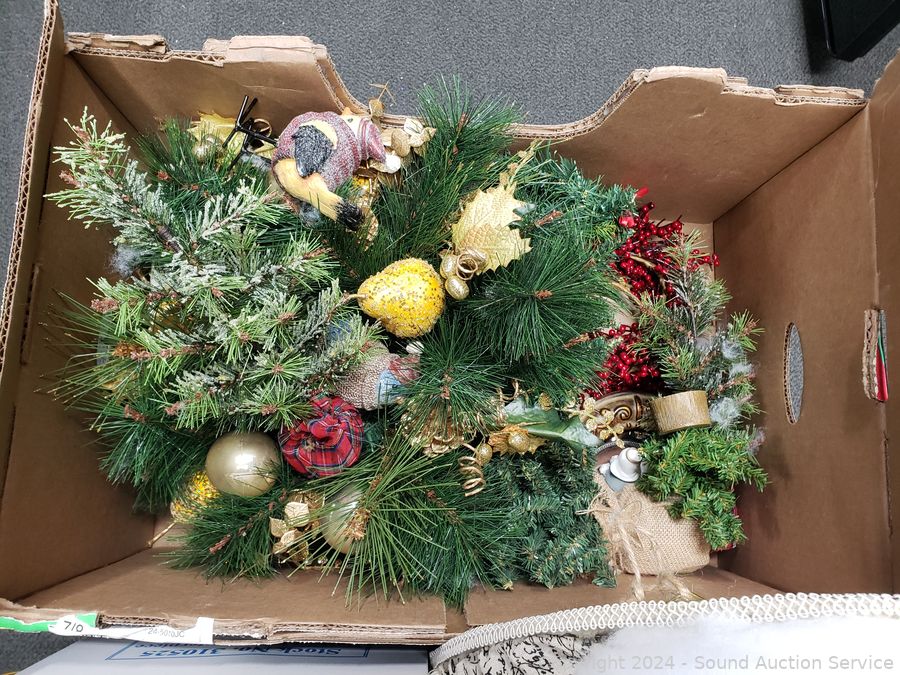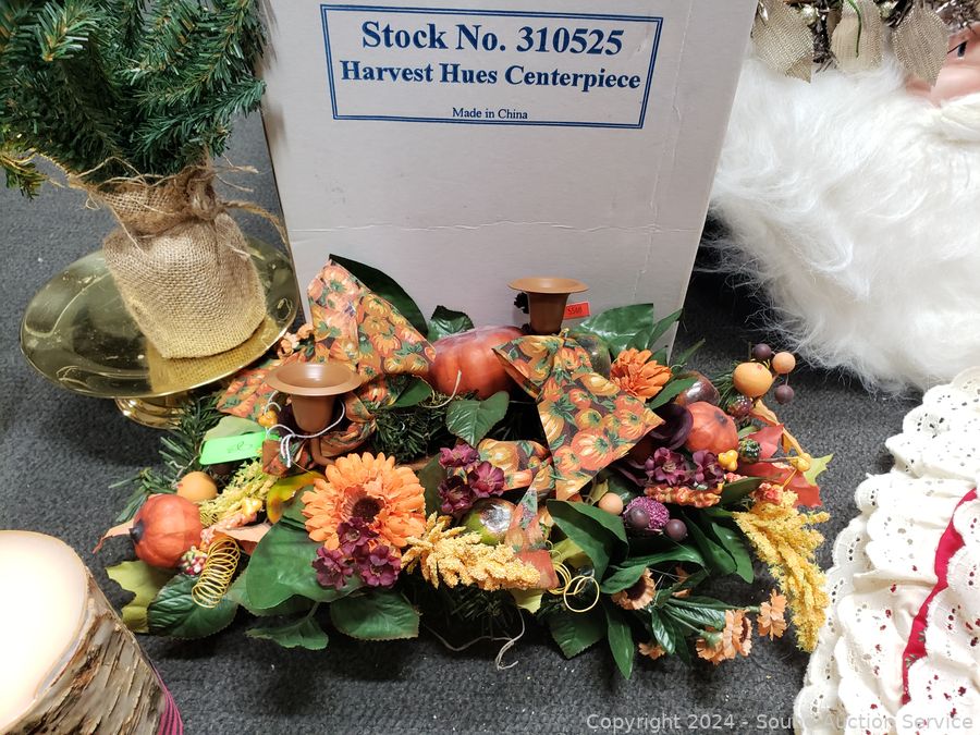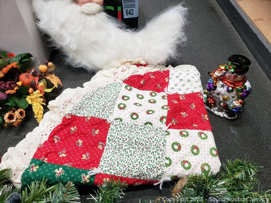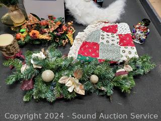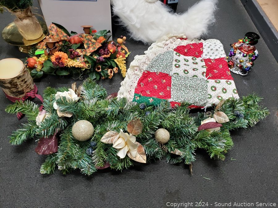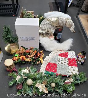 Door hangers, tree decor, candles, tree skirt, centerpieces, etc. Refer to photos for lot contents, more details.