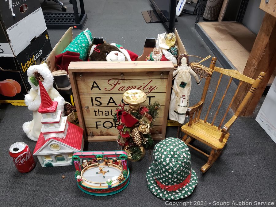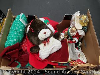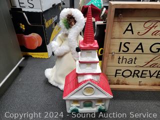 Angel dolls, stockings, doll chair, lighted church (no light), angel dolls, bells pillow hanger, etc. Refer to photos of lot contents, more details.