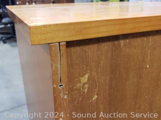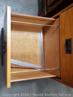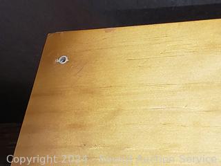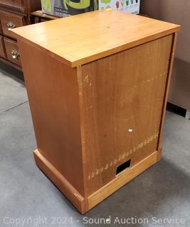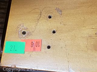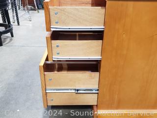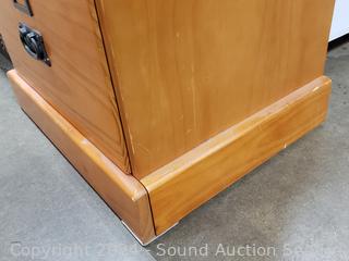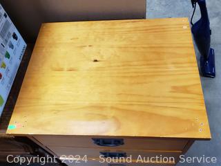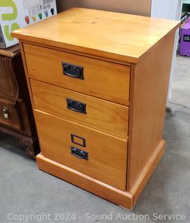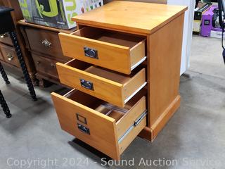 1 file drawer with 2 other drawers. 29" H x 21" W x 17" D. Holes drill in the corner of the top to attach something. Overall good condition. Appears to be all wood construction.