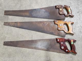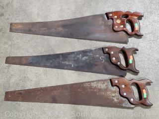 Approx. 26" blades. Brands include Warranted Superior, 2 Disston, Sheffield & others.