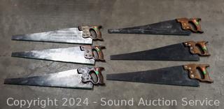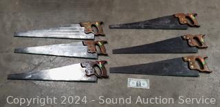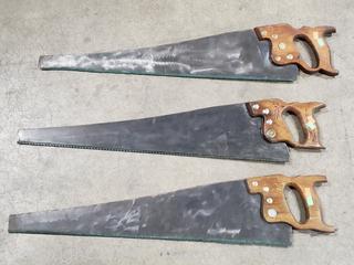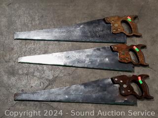Brands include Warranted Superior and Disston. 26" long blades, some wear from age, use.