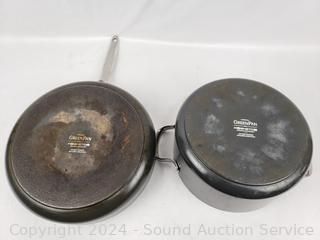 Inside of pans are all in excellent condition, bottoms of pans have wear from use, burn marks. 2qt/3qt? saucepans, 6qt? boiling pot, 8/10/12" skillets. Refer to photos for more details.