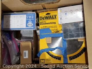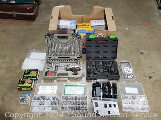 Crescent kit & Pittsburgh Impact Socket kit appear to be complete or mostly complete, several hardware assortment kits, DeWalt circular saw blades, Gearwrench hex key set with stands. Tons of value here!