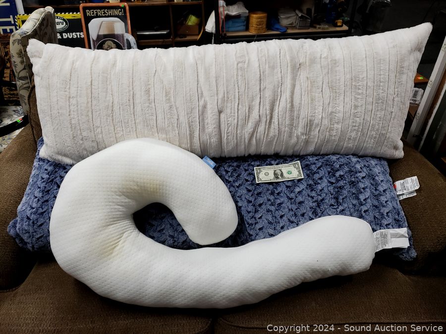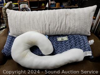 Contour body pillow 6" x 24" x 72" (stained dirty), 2 plush body pillows 20" x 54" (have broken zippers). Refer to photos for more details.