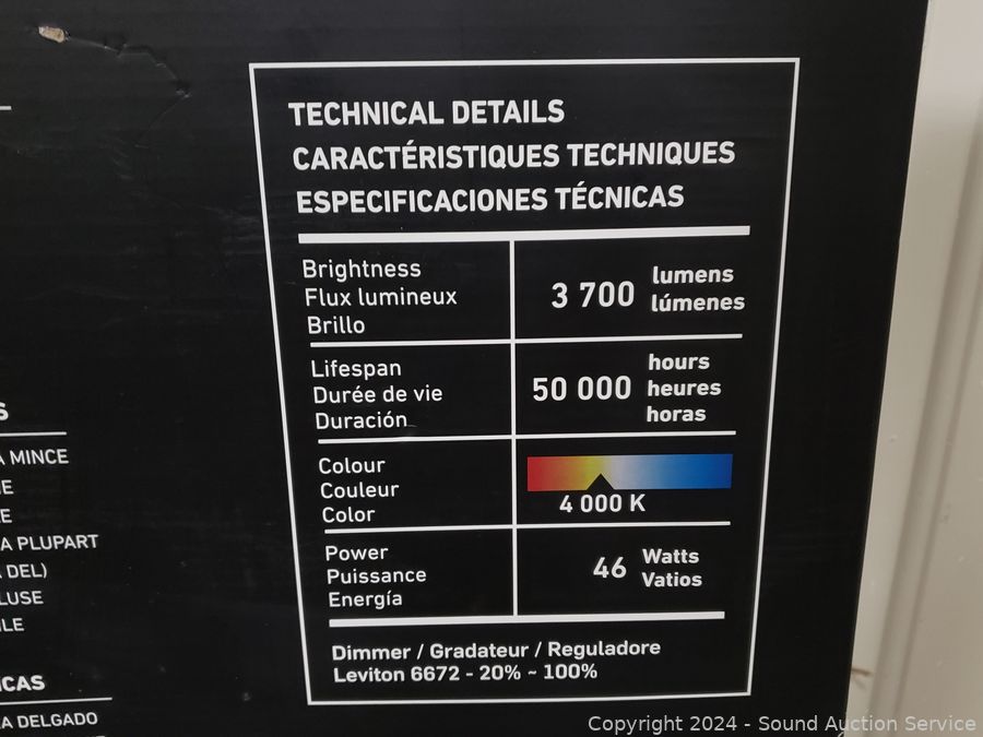 Integrated LED's, 46W, 3700LM, 4000K color. 11.81" x 47.76" x 0.79". Appears new, don't see any issues.