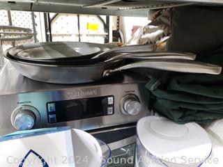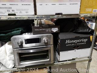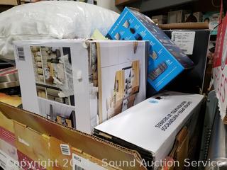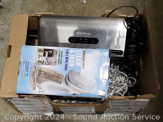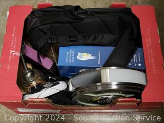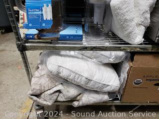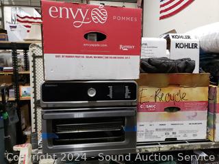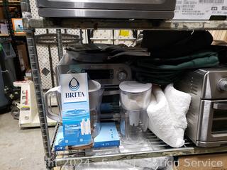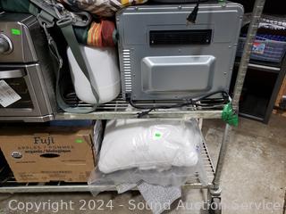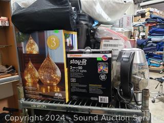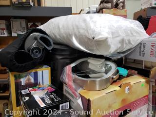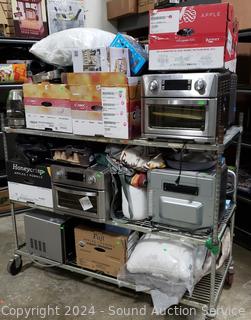 Countertop air fryer ovens, gloves, backpack, ceiling light, water filter pitchers, pillows, string lights, raindrop lights, bath accessories set, cooler, etc. Cart NOT included. ATTN: All items are used, may be missing pieces, damaged, not functioning, complete, no issues, etc. All items as is. Refer to photos for more details.
