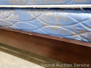 Older mattress & box spring, don't see any major issues. Approx. 35" to 43" H x 56" W x 72" long rails.