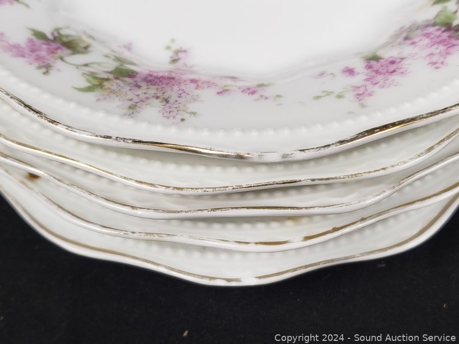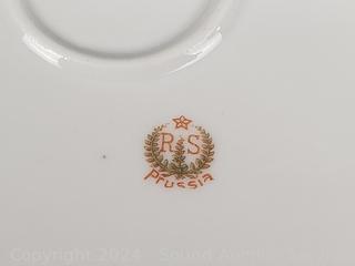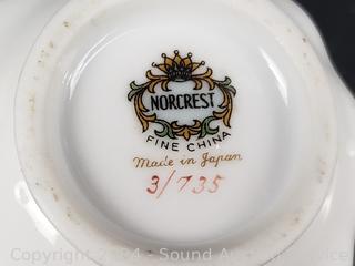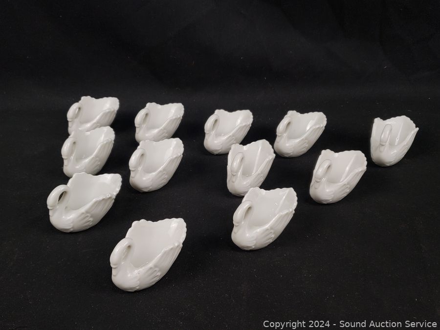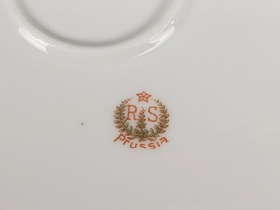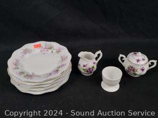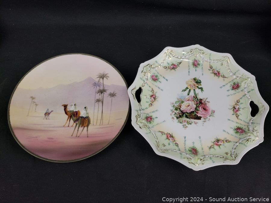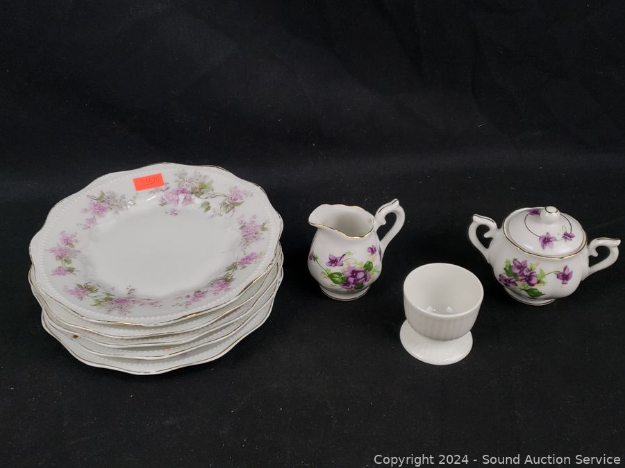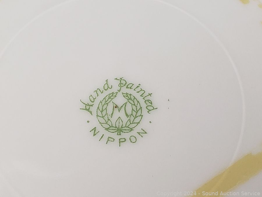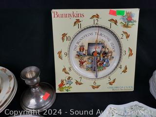 11pc Bunnykins Dishes & Clock, 5 Austria saucers, Norcrest cream, sugar, Prussia plate, Nippon hand painted, Swan salt cellars, Roger silver plate candleholder. Don't see any major issues.