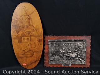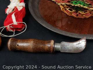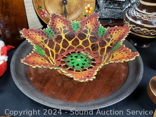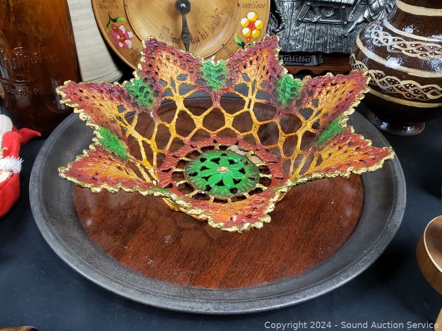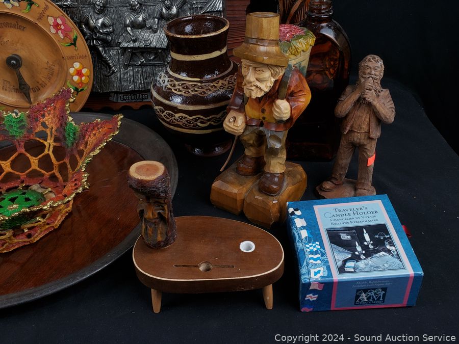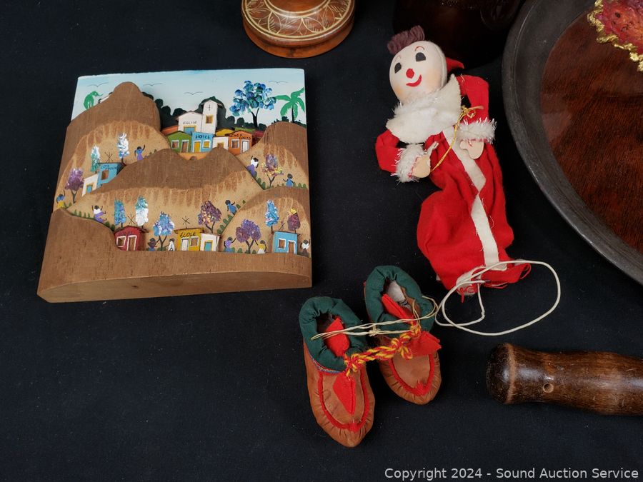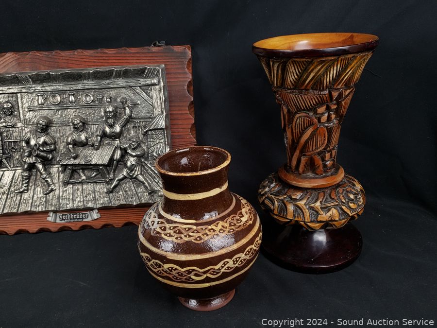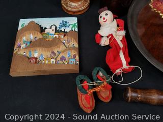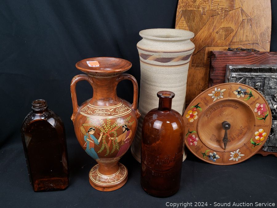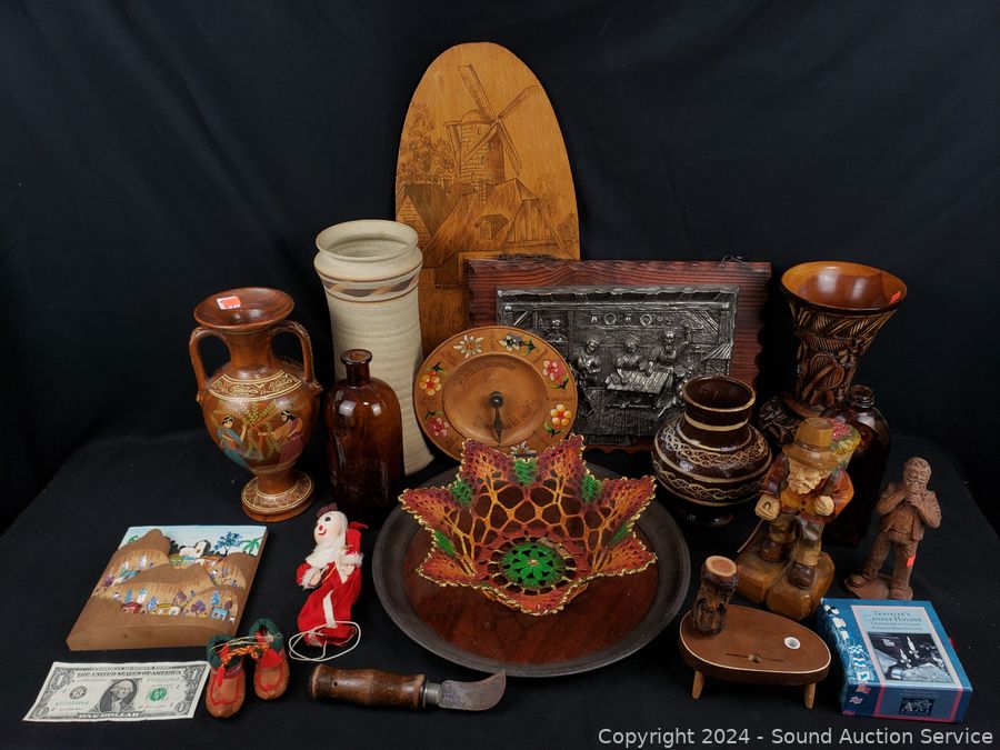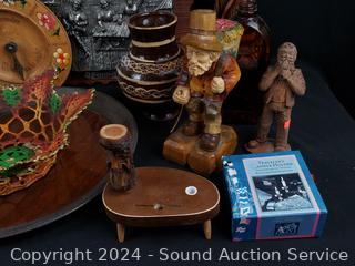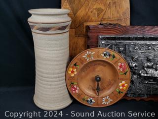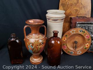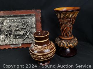 Pottery vases, carved wood figure, plaque wall decor, crochet painted bowl, tin tray, etc. Refer to photos for more details.