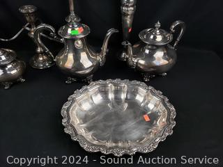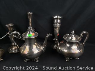 Teapots, cream, sugar, candelabra, serving tree, bowl, etc. Most appear to be by Regent.