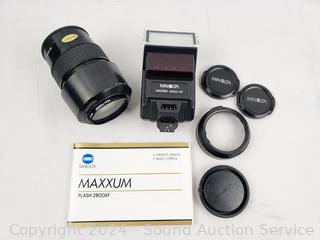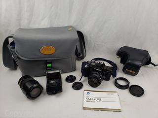 Maxxum 35-70mm 1:4 lens, Maxxum 100-200mm 1:4.5 lens, Maxxum 2800 AF flash, LTD camera bag. Untested. In great cosmetic condition.