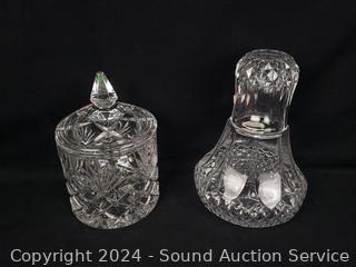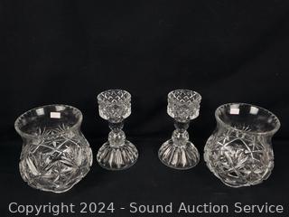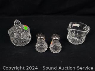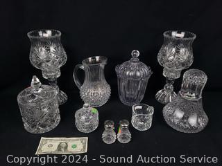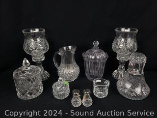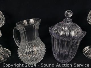 (2) 2pc Candle Lamps, pitcher, cream, sugar, salt/pepper, 2 covered dishes (one is chipped), decanter w/highball glass. Refer to photos for more details.