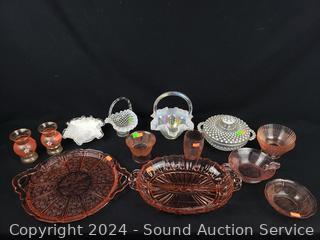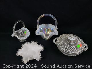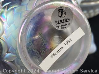Iridescent handle basket is marked Fenton. Refer to photos for lot contents, more details.