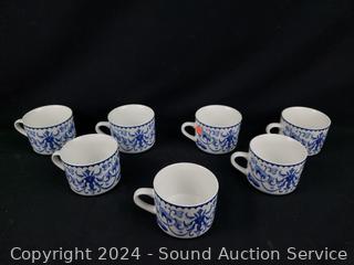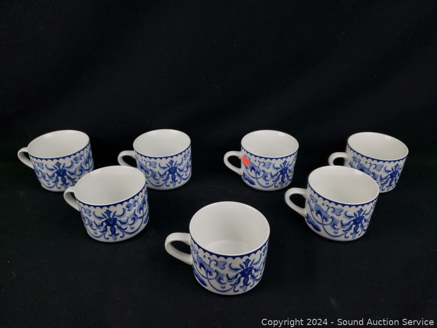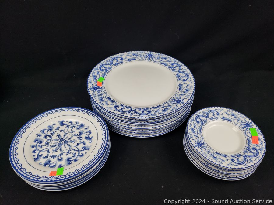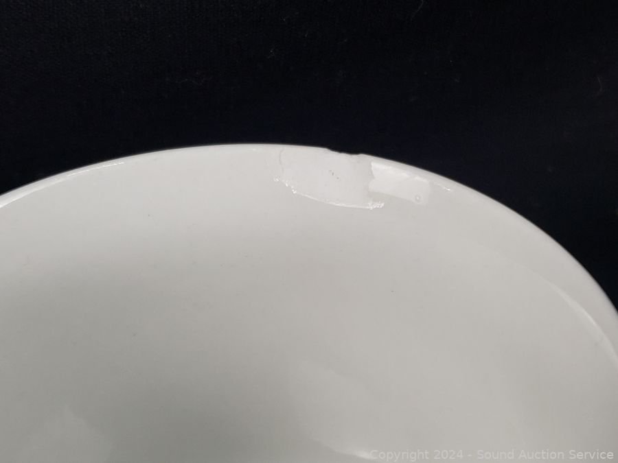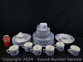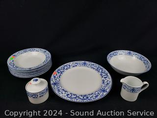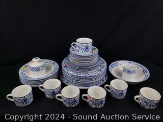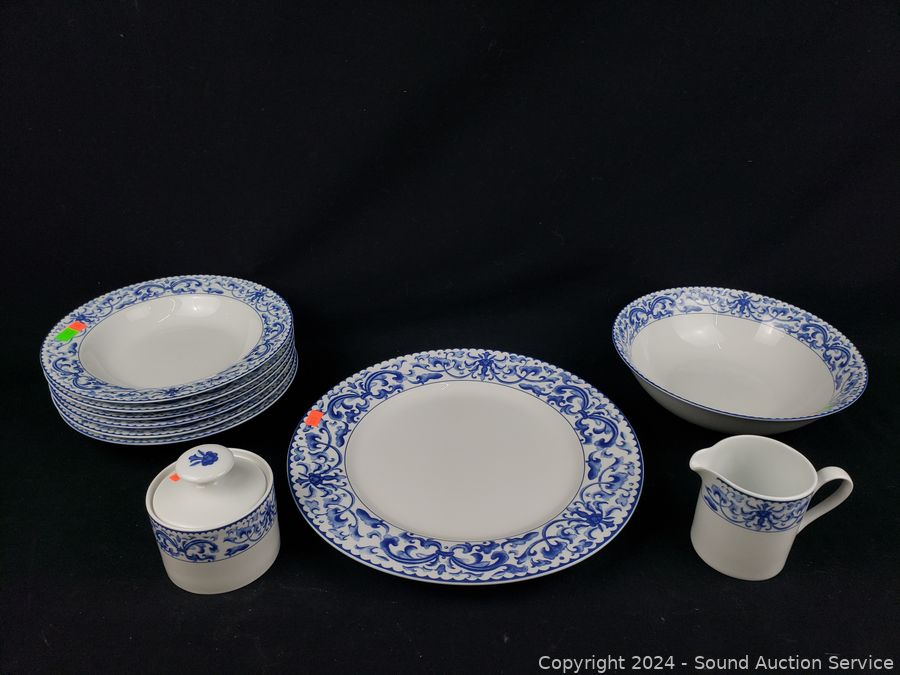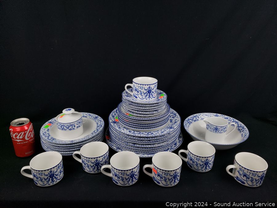 5pc service for 6 w/extras. 1 cup is chipped. 7 cups, 6 saucers, 6 soup bowls, 6 snack/salad plates, 8 dinner plates, 11.5" charger, cream, sugar, 9" serving bowl. Don't see any other issues.