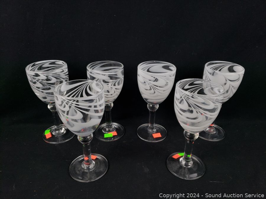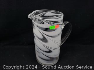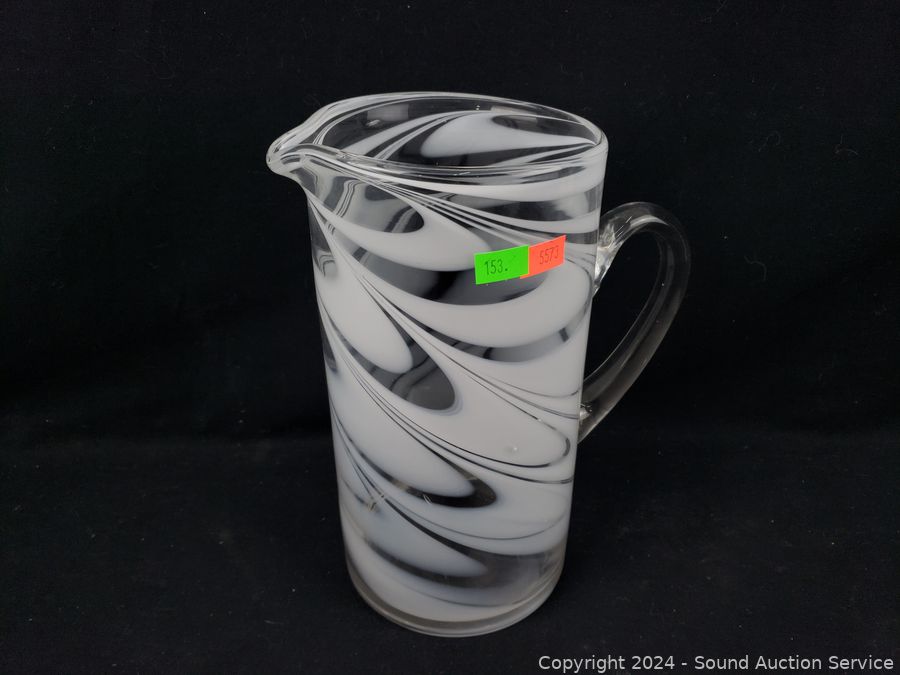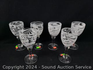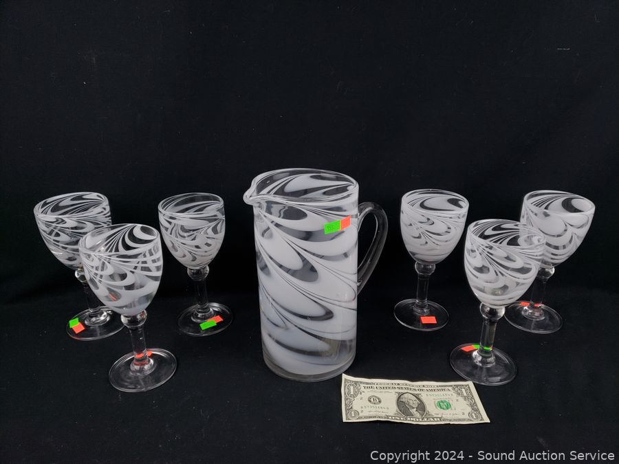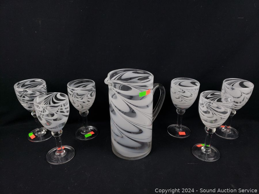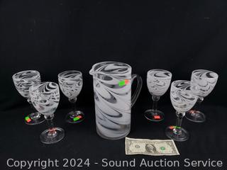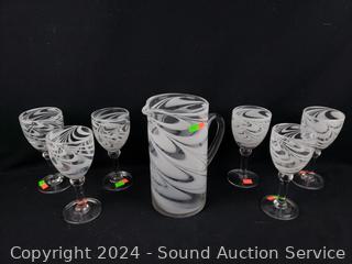 Lot #0153: 6pc Hand Blow White Swirl Stemware & Pitcher Set