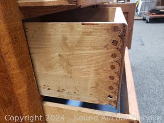 35.5" H x 39" W x 21" D. All wood construction, peg joinery. Olde patina, signs of wear from age, use. Missing one pull from top drawer.