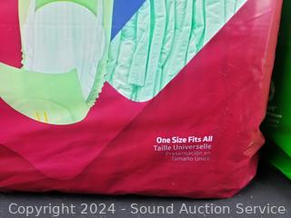 Approx. 44-56" diapers. 13" x 34" Liners. Refer to photos for lot contents, more details.