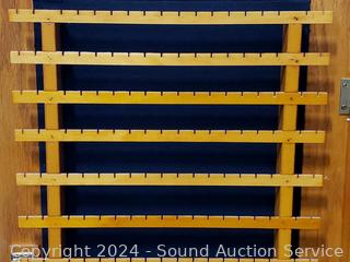 57" H x 14.5" W x 3.75" D. Locking, NO key.