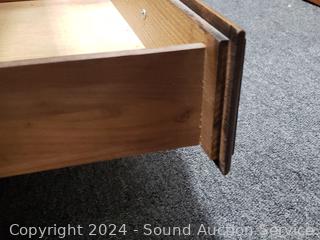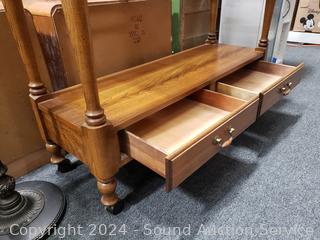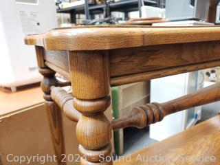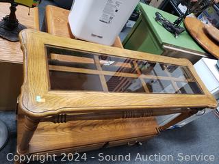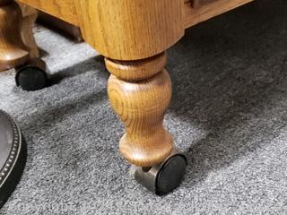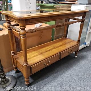 Lot #0023: Oak 2-Drawer Glass Top Rolling Sofa/Hall Table