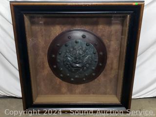 Unsure if authentic or replica. Shield is approx. 24" Dia. 43.5" x 43.5" x 5.5" shadowbox. Some scuffs, dings, wear to finish on frame.