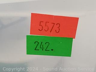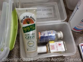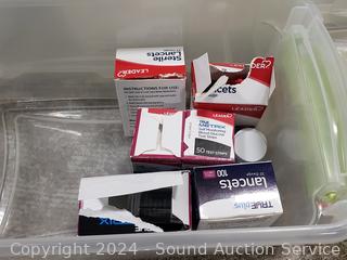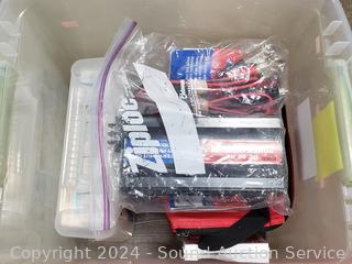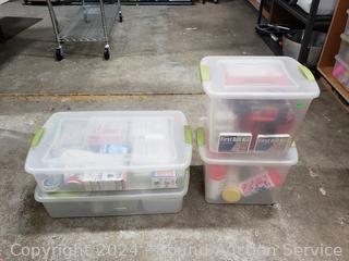 Refer to photos for lot contents, more details. 6" x 15.75" x 26" & 11.75" x 16" x 12.75" totes with lids.