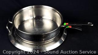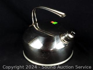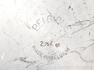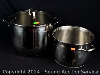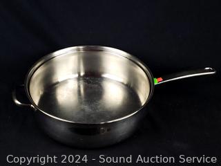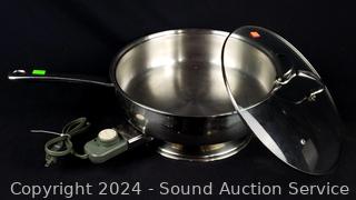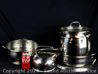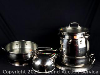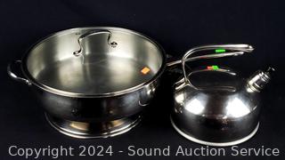 12" Electric skillet, tea kettle, 2 boiling pots 8qt/16qt, 12.5" multi-purpose skillet. Signs of wear from finish.