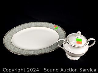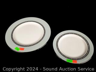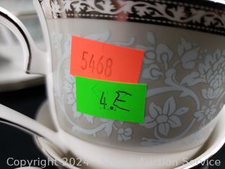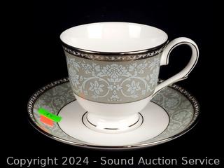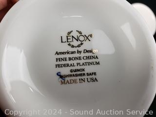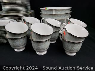 The subtle glitter of precious platinum provides a light contrast to a lace pattern against a sky blue background, on this durable bone china. 5pc Place setting approx. $200 on Lenox website. Service for 15 - 14 cups, 15 bread plates, 15 salad plates, 15 soup bowls, 15 saucers, 15 dinner plates, sugar, gravy boat, (3) 8.5" bowls, (2) 13" platters. Don't see any issues. In excellent condition.