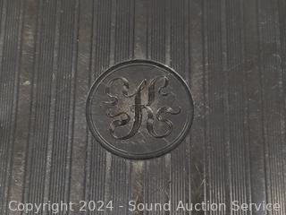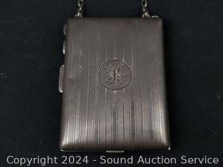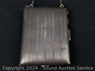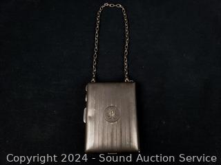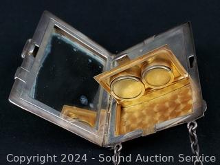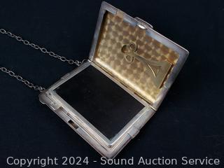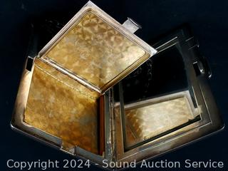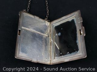 Marked sterling behind the mirror, tested inside and outside of case, chain, latch, money clip, all tested silver. TW: 238.52g some mirror weight. 3.5" x 2.5" x 5/8". Monogrammed with a "K".
