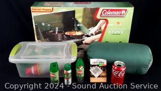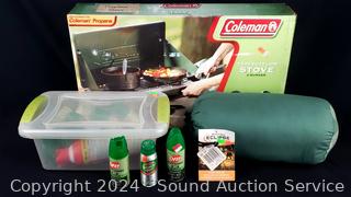 Lot #0259: Coleman Propane Camp Stove, Camp Pillow, Off Insect Repellant