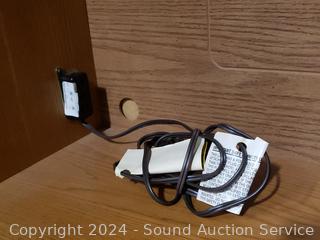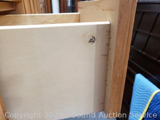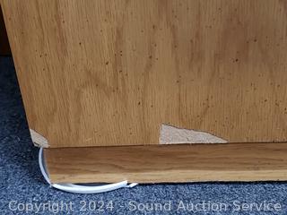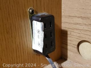 Built in outlet in cabinet, missing a shelf in cabinet. Appears to be all wood construction. 60.5" H x 56" W x 20" D.