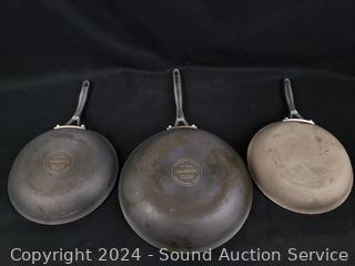(2) 8", (1) 10", (2) 12". Signs of wear from use (heat stains on the bottoms), overall good condition.