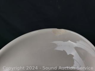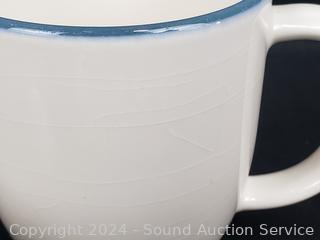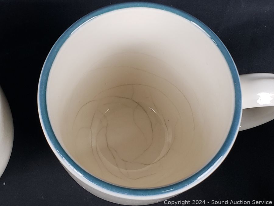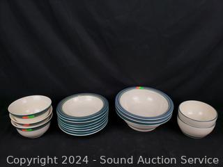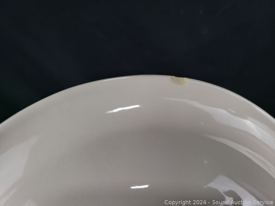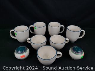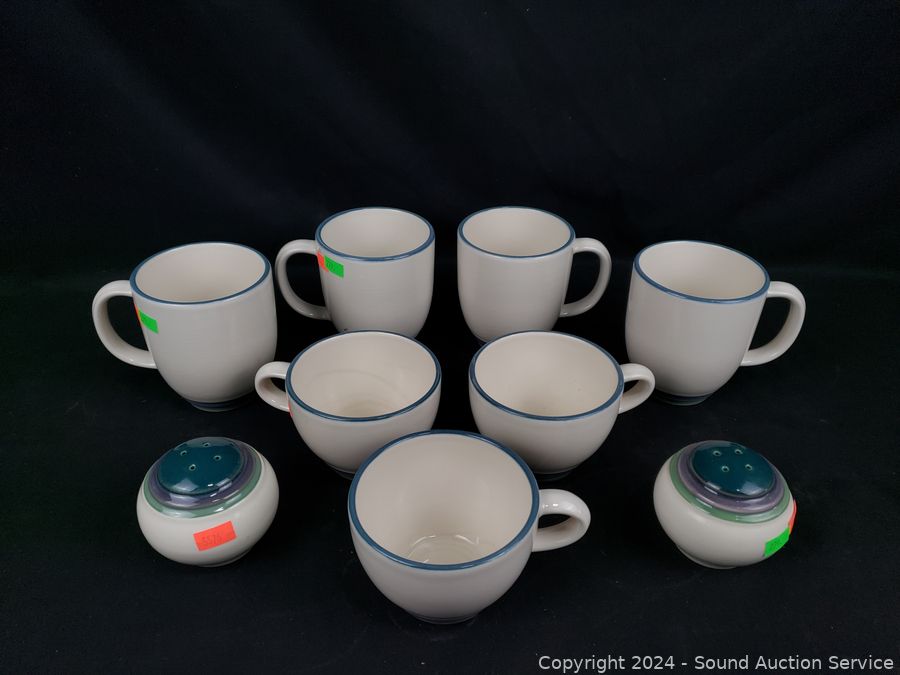 14 dinner plates, 5 cereal bowls (2 different sets), 4 mugs, 3 teacups, salt/pepper, (3) 9.75" bowls, 7 soup bowls (1 is chipped), 8 snack plates, 4 salad plates, 7 saucers (1 is chipped). Some crazing, wear from use.