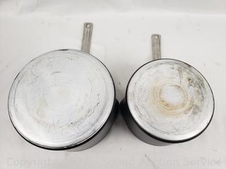 2qt, 3qt saucepans, 10"/12" skillets, 12" multipurpose pan, 4qt/6qt boiling pots. Some light wear, scuffs, scratches, could use a proper wash, a little dirty.