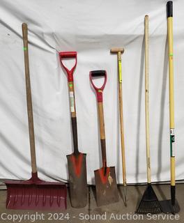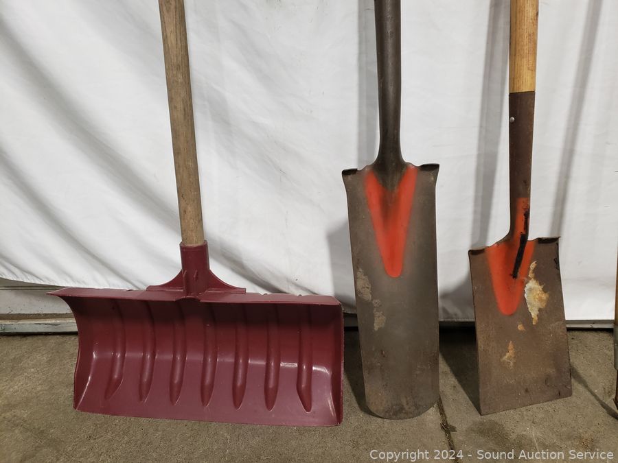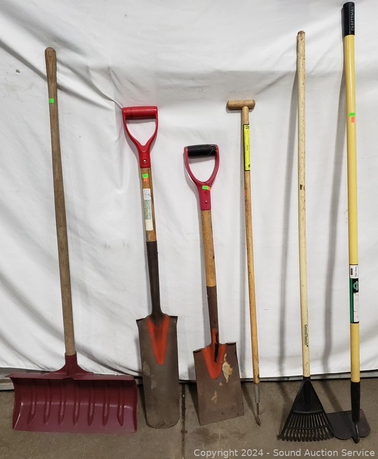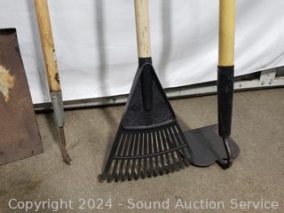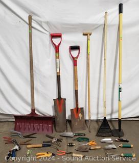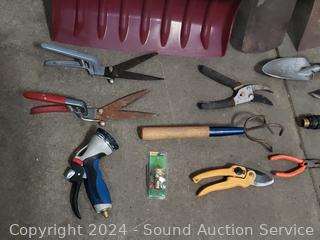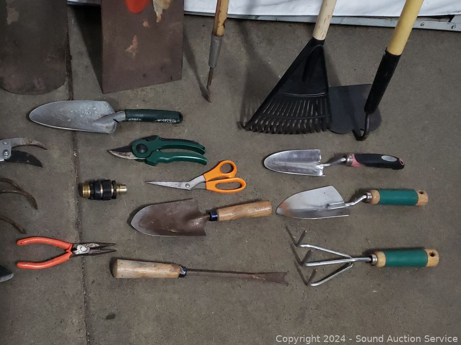 Various garden tools, shovels, hoe, weed puller, hoe, garden shovels, pruners, etc.