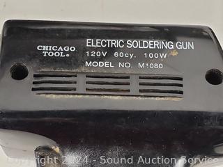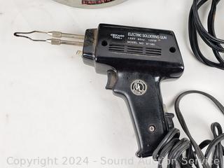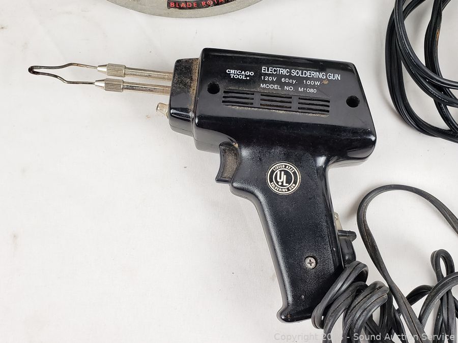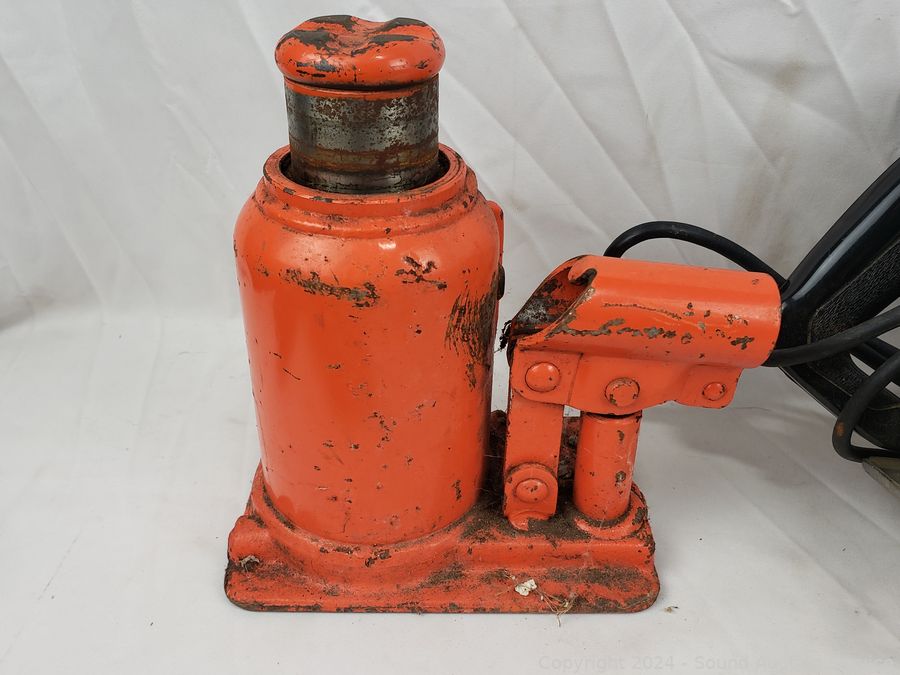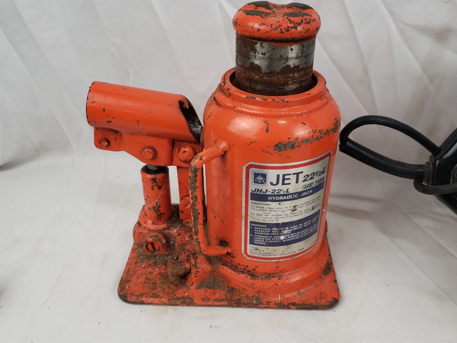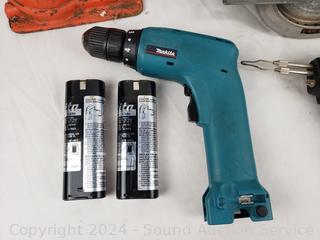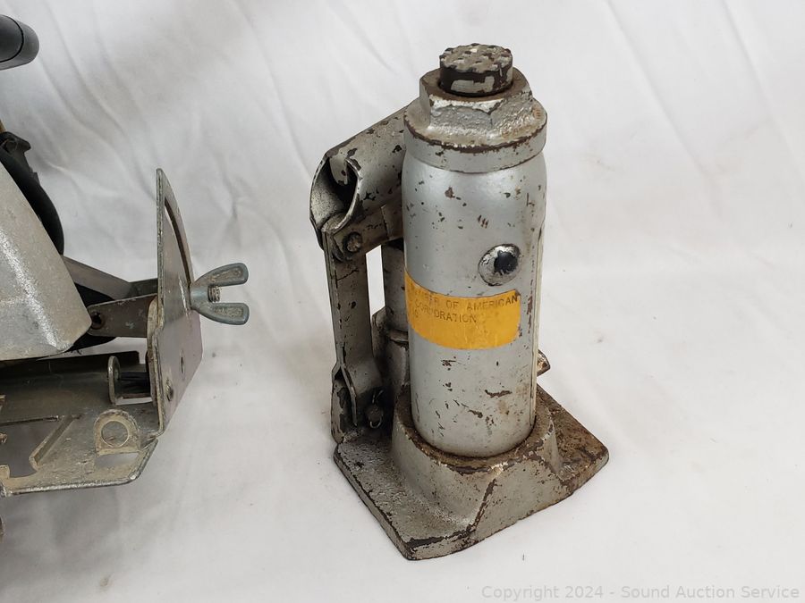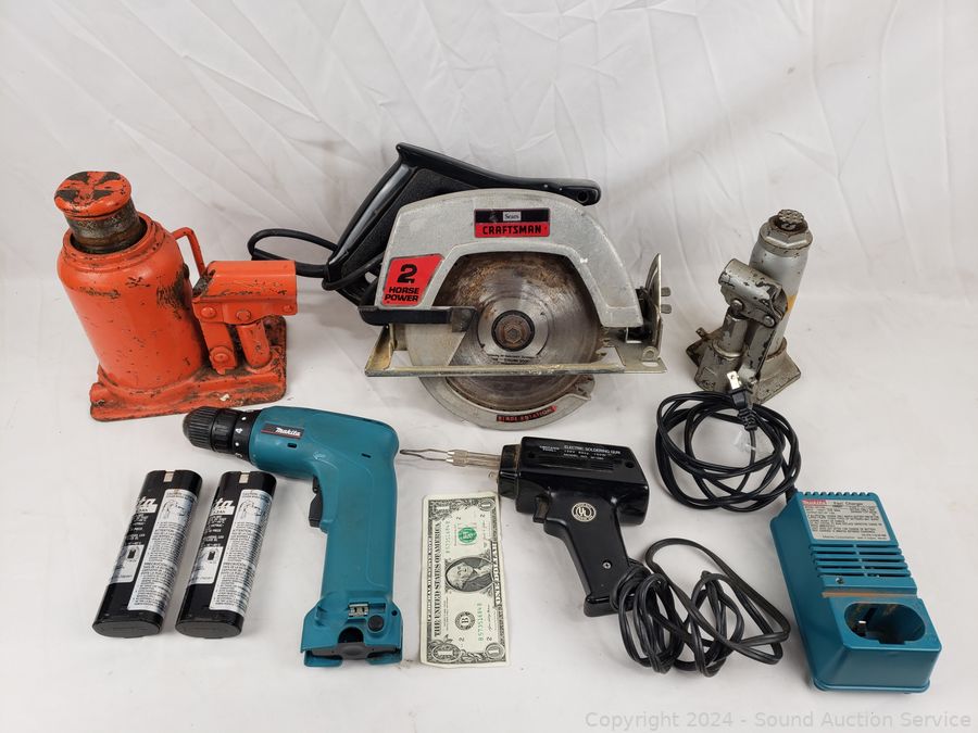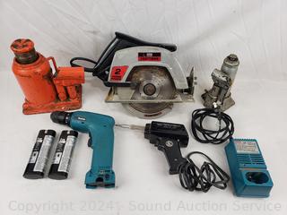 Craftsman 7-1/4" circular saw (works), Jet 22-1/2 Ton Bottle Jack (no handle), Chicago Soldering Gun, Makita 3/8" Cordless 7.2V drill w/2 batteries & charger (works), Small bottle jack (unsure on the tonnage). Refer to photos for more details.