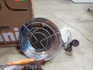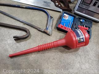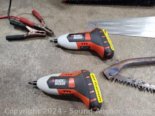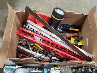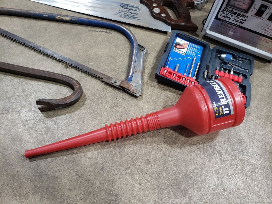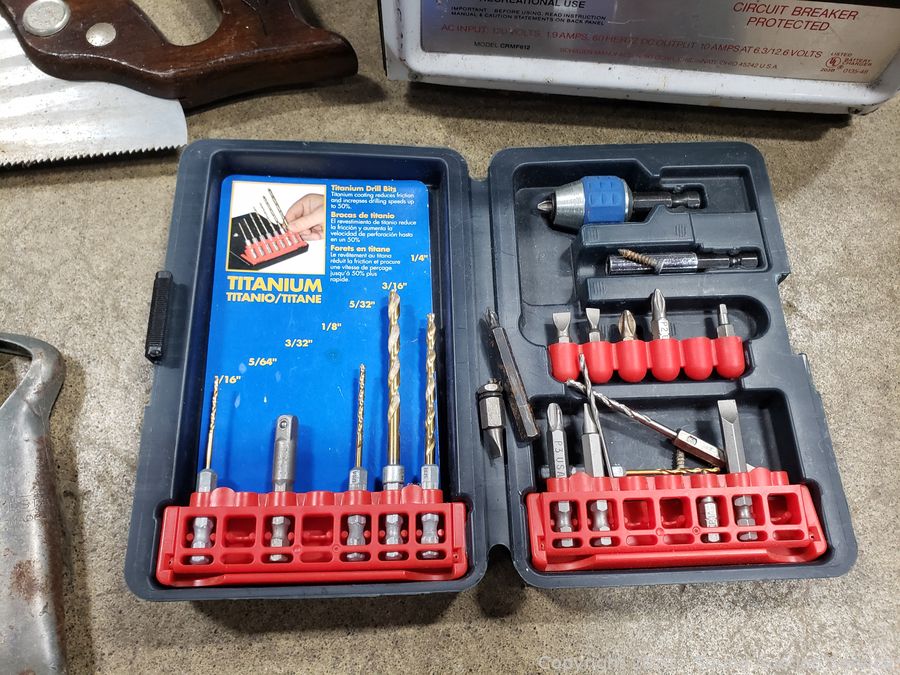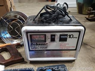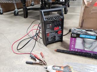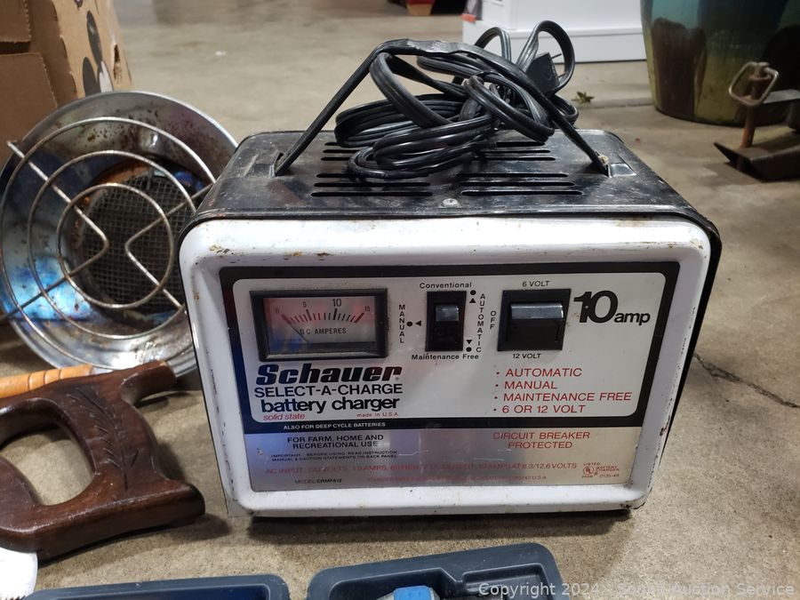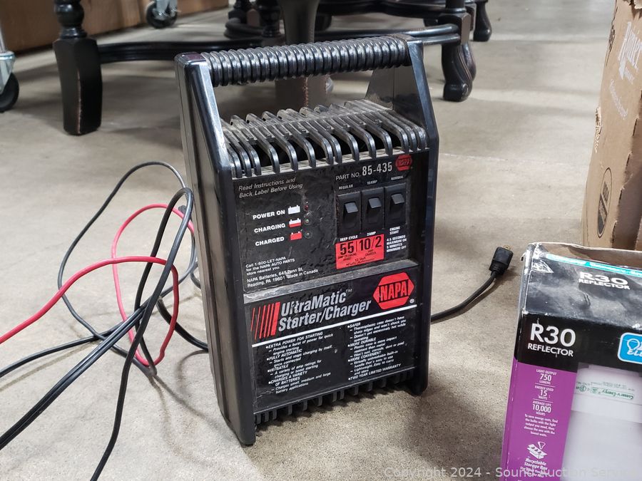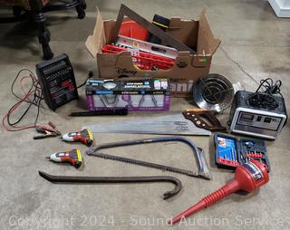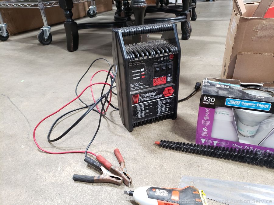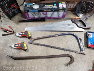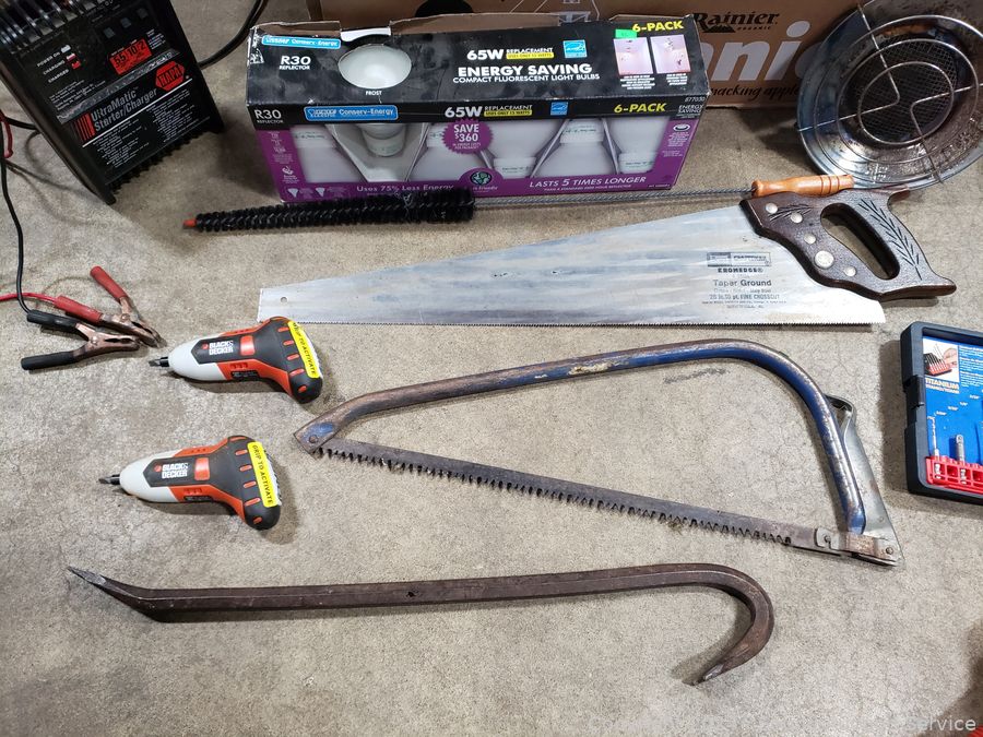 Crowbar, hand saw, ultramatic starter/charger, Schauer battery charger, floodlights, various hand tools. Refer to photos for lot contents, more details.
