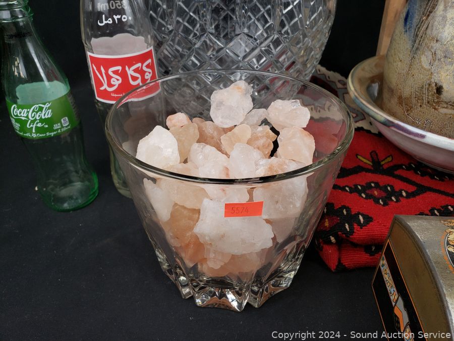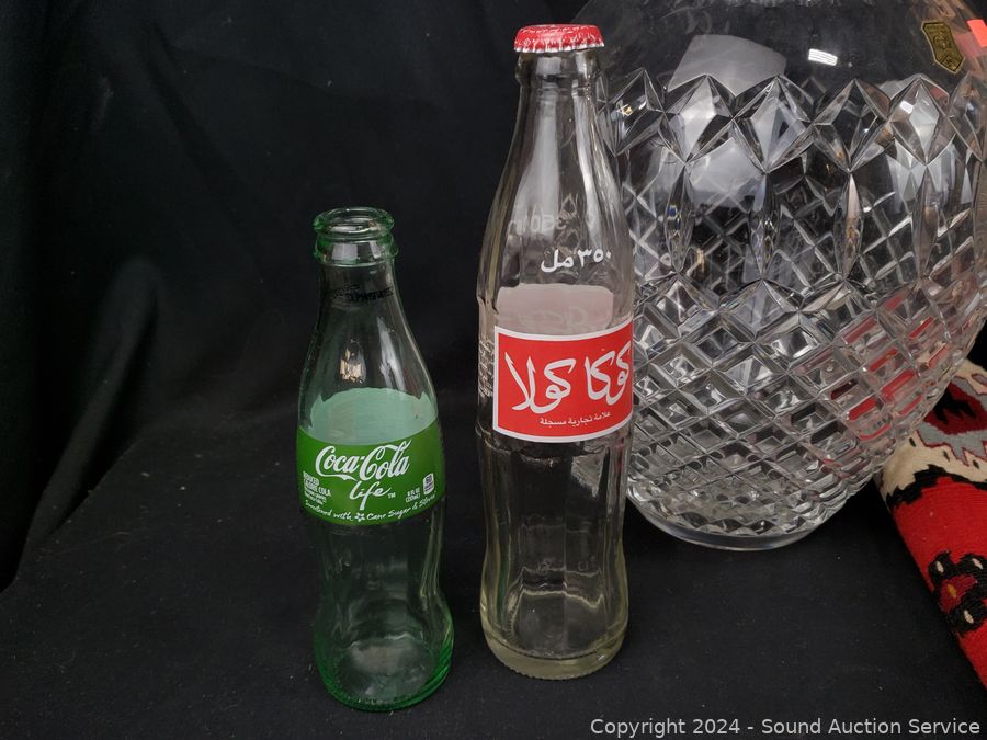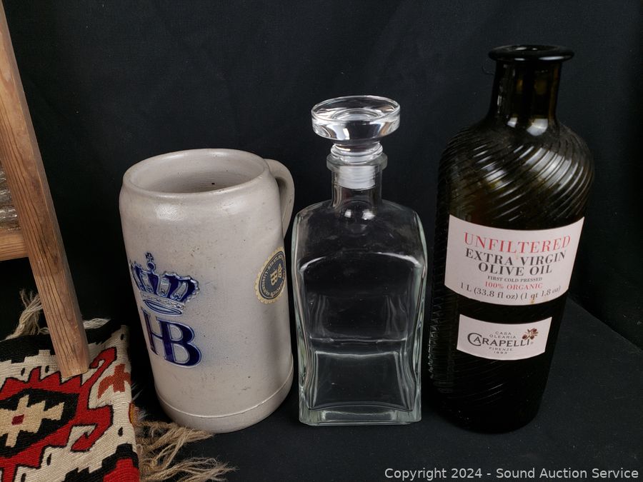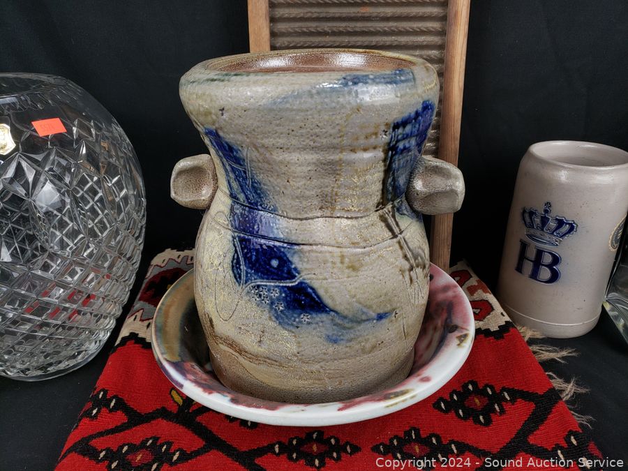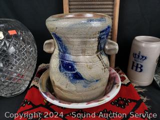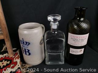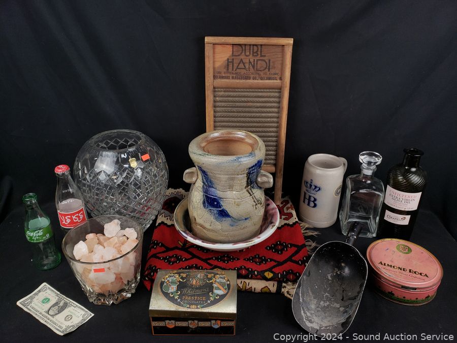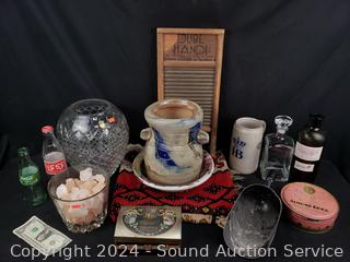 Hand woven rug 56" x 28", scoop, Crystal vase 10.5" H x 9" Dia., pottery jar (no lid), German stoneware mug, decanter, washboard, Coke bottles, etc. Refer to photos for lot contents, more details.