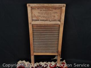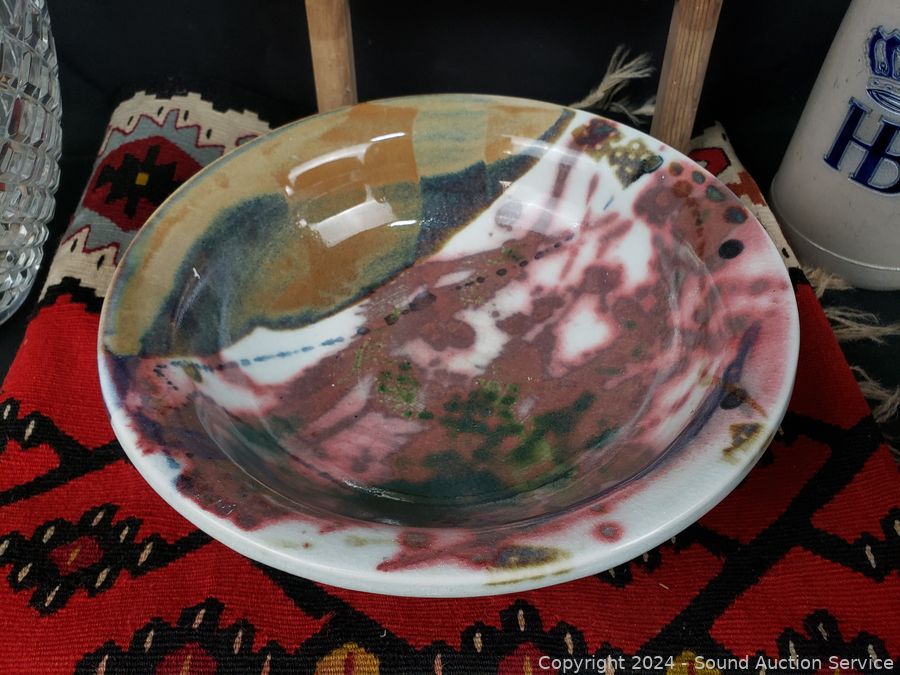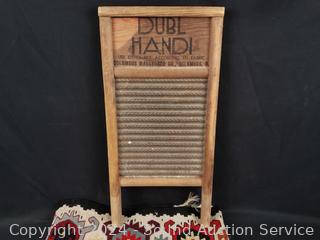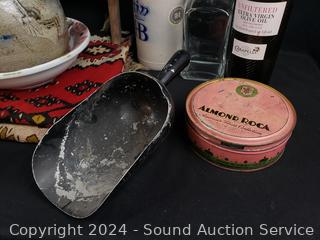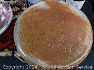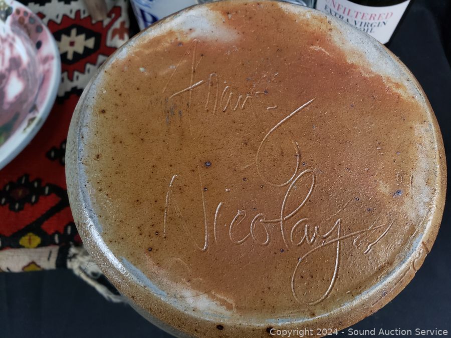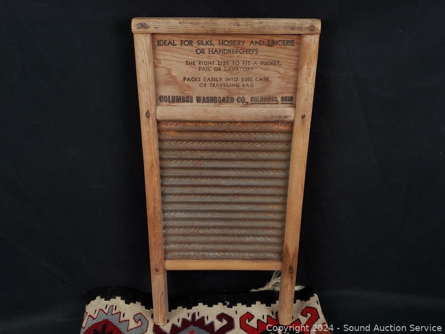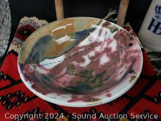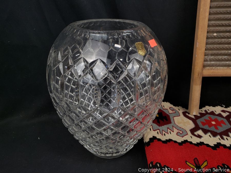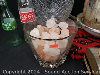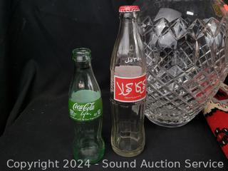 Hand woven rug 56" x 28", scoop, Crystal vase 10.5" H x 9" Dia., pottery jar (no lid), German stoneware mug, decanter, washboard, Coke bottles, etc. Refer to photos for lot contents, more details.